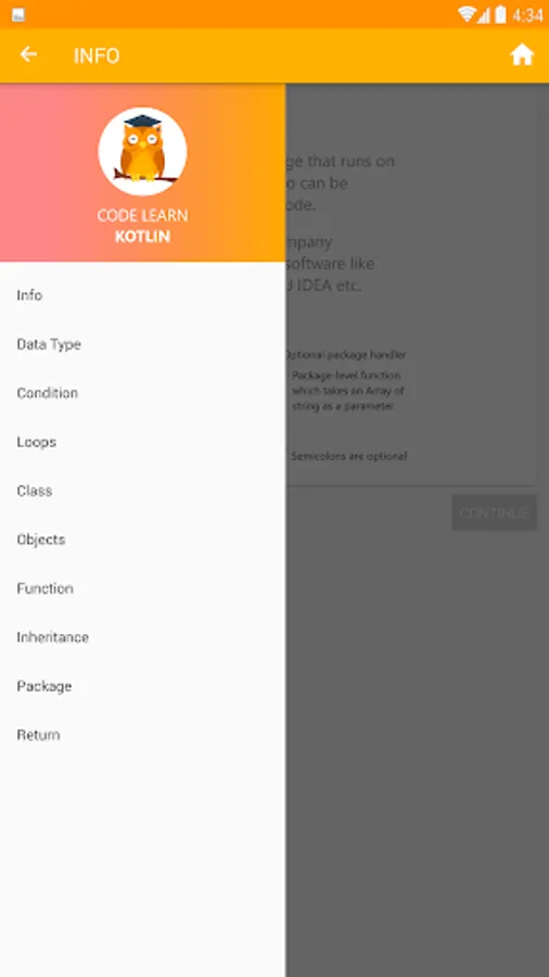 Code Kotlin provides a beginner guide to start programming in kotlin , the app gives a brief theoretical description about various Object oriented programming concepts like class, object, function etc. and how they are applied in kotlin and how to use them.