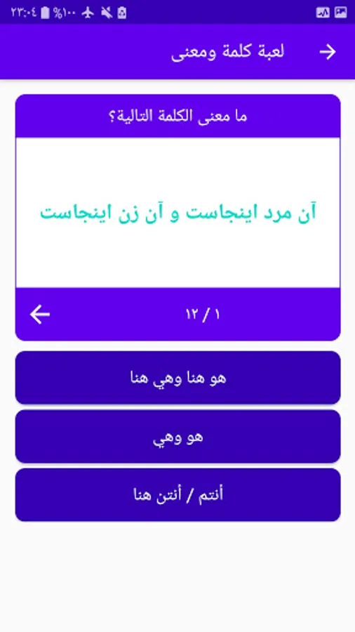 Through this game a word or sentence appears in the Persian language for you, and you will find at the bottom three options for an answer from the Arabic language. Choose the correct answer, and also when you answer a wrong question, the correct answer will appear to you through the dialogue box moving to the second question