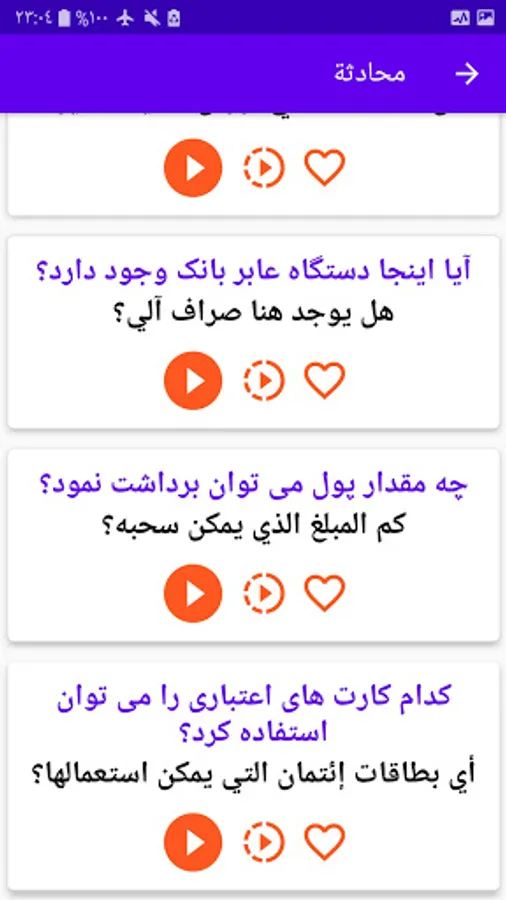 It contains thirty-three lessons and contains more than 1027 sentences in the Persian language and also 1027 sentences in the Arabic language with pronunciation without internet in both languages