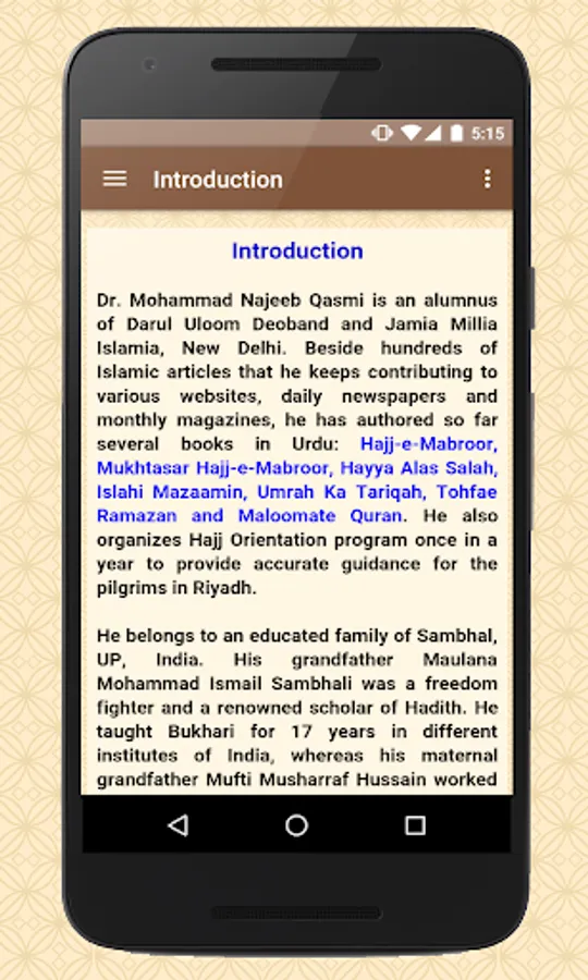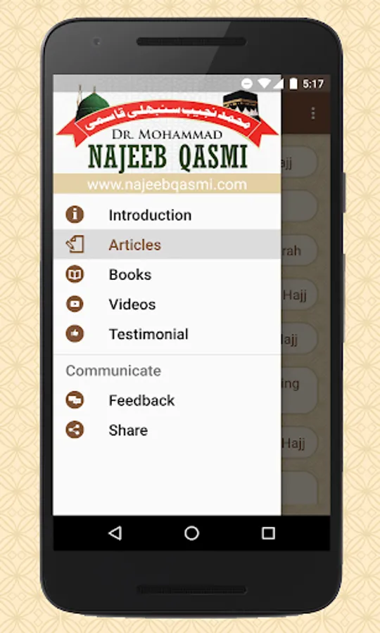 After installing this App within 2 minutes, one can have 3 books on Hajj & Umrah (Hajj-e-Mabroor, Mukhtasar Hajj-e-Mabroor & How to Perform Umrah?), 9 Lectures, Method of performing Hajj & Umrah, Presentation, one hour Questions & Answers and 21 articles will be in the hands of Hajj pilgrims and can be used anywhere during the journey, in Makkah, Mina, Muzdalifah and Arafat. After installing this App, one can take benefits of the Articles without internet, though for listening the Lectures, internet connection is needed.