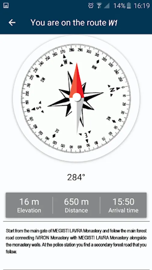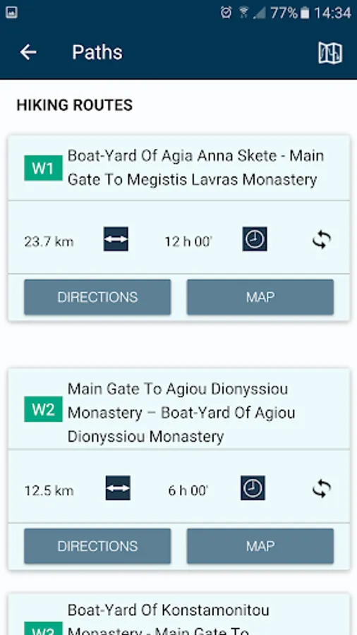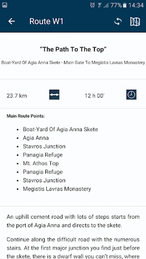 The app contains high resolution digital maps with five zoom levels (1: 250.000 – 1: 15,000), compressed to 35.6 ΜΒ. Also, contains a detailed description of 15 trails of Mountain Athos and compass functionality. When the user is in the field, the application provides the user with contextual information with instructions, based on criteria of location (device GPS) and its direction. Moreover, the application informs the user about the destination’s distance and the estimated time of arrival.