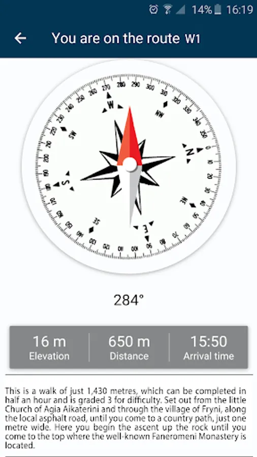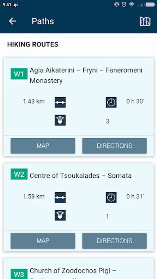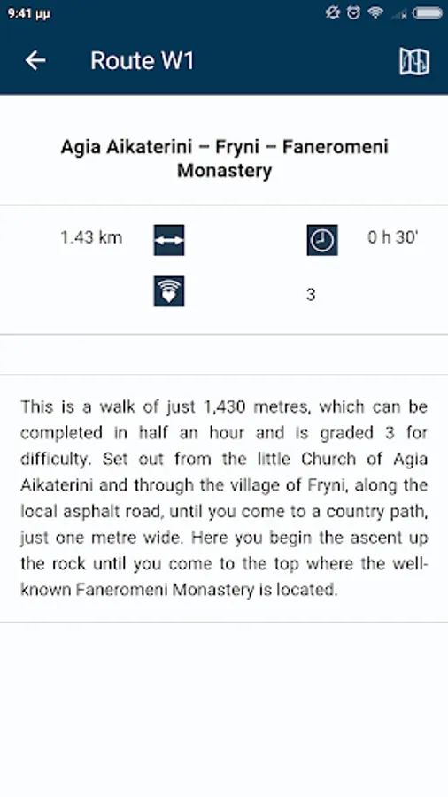 The app contains high resolution digital maps with five zoom levels (1: 250.000 – 1: 15,000), compressed to 35.6 ΜΒ. Also, contains a detailed description of 20 trails of Ikaria Island and compass functionality. When the user is in the field, the application provides the user with contextual information with instructions, based on criteria of location (device GPS) and its direction. Moreover, the application informs the user about the destination’s distance and the estimated time of arrival.