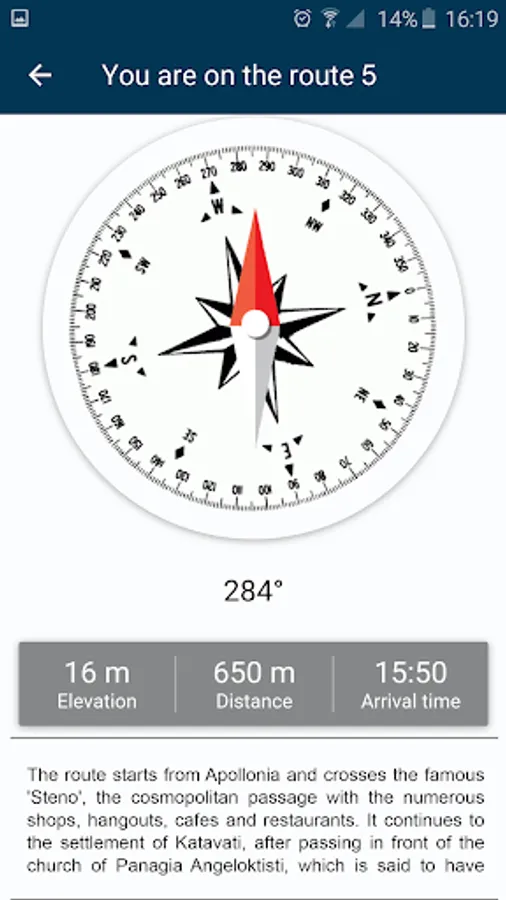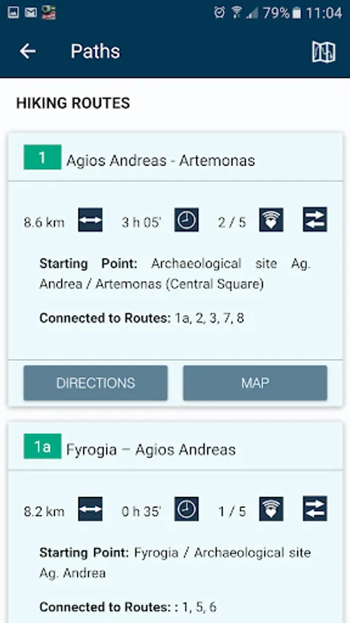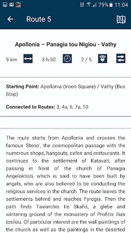 The app contains high resolution digital maps with five zoom levels (1: 250.000 – 1: 15,000), compressed to 35.6 ΜΒ. Also, contains a detailed description of 19 trails of Sifnos Island and compass functionality. When the user is in the field, the application provides the user with contextual information with instructions, based on criteria of location (device GPS) and its direction. Moreover, the application informs the user about the destination’s distance and the estimated time of arrival.