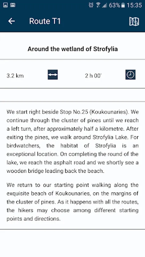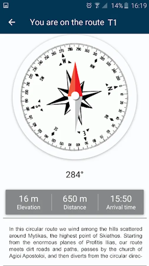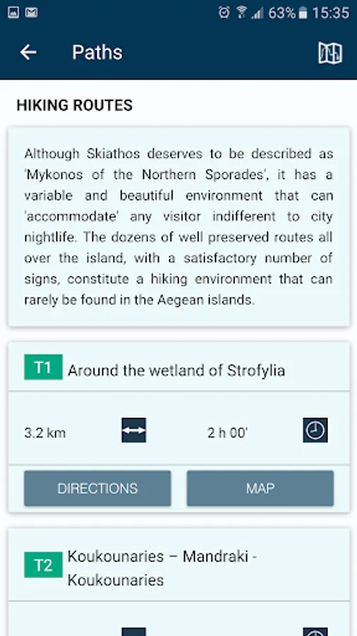 The app contains high resolution digital maps with five zoom levels (1: 250.000 – 1: 15,000), compressed to 35.6 ΜΒ. Also, contains a detailed description of 18 trails of Skiathos Island and compass functionality. When the user is in the field, the application provides the user with contextual information with instructions, based on criteria of location (device GPS) and its direction. Moreover, the application informs the user about the destination’s distance and the estimated time of arrival.