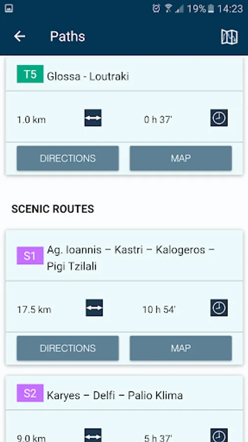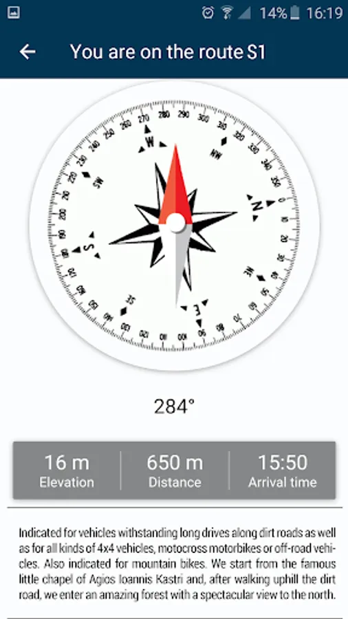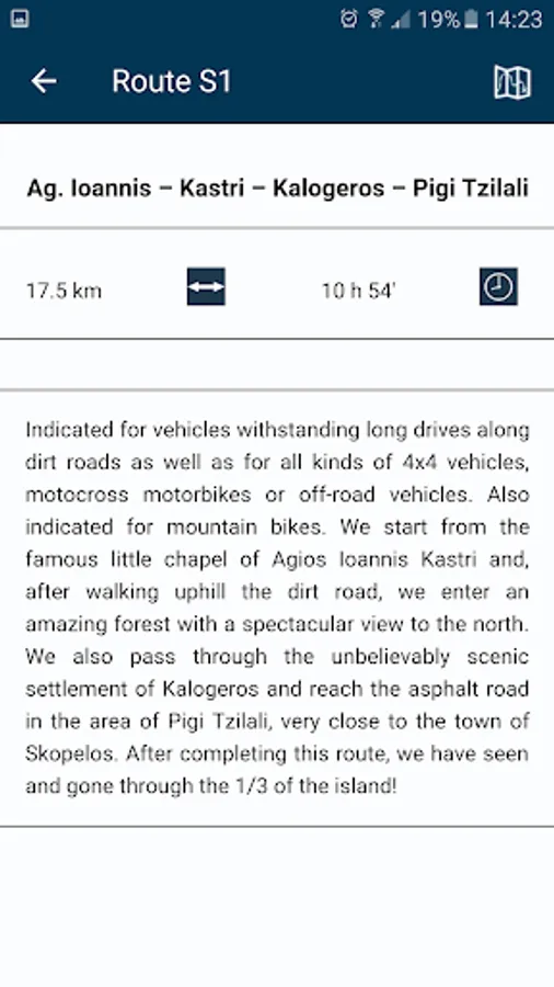 The app contains high resolution digital maps with five zoom levels (1: 250.000 – 1: 15,000), compressed to 35.6 ΜΒ. Also, contains a detailed description of 13 trails of Skopelos Island and compass functionality. When the user is in the field, the application provides the user with contextual information with instructions, based on criteria of location (device GPS) and its direction. Moreover, the application informs the user about the destination’s distance and the estimated time of arrival.