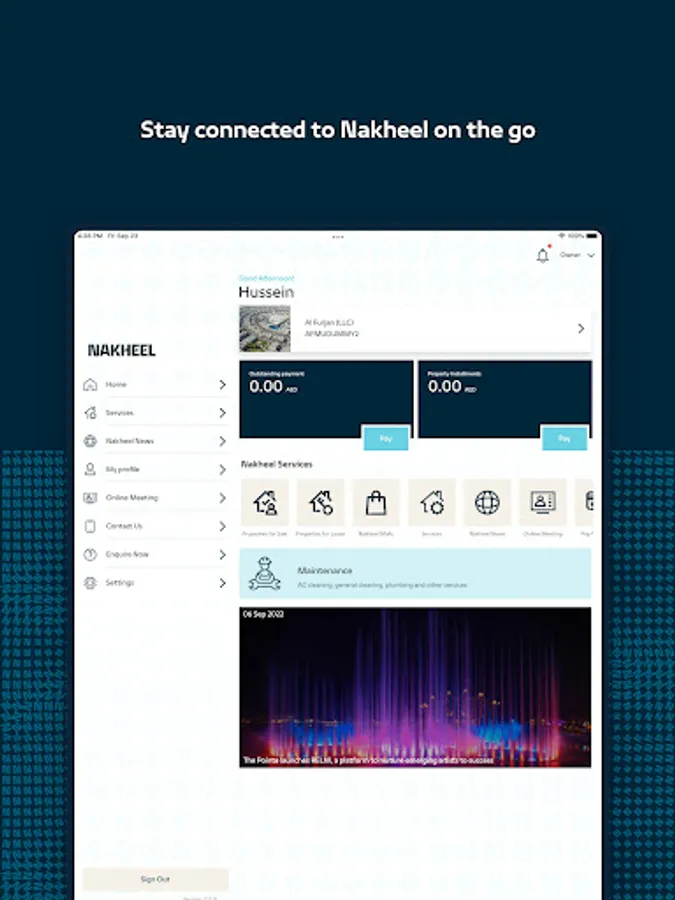 Manage your Nakheel properties anytime, anywhere, and stay connected to Nakheel on the go. View property information at a glance and access services as well as the latest news with ease. Download the app to make payments, schedule maintenance requests, and more.