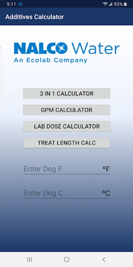 An app to help Nalco additive field techs with calculations for additives treatments. The current version contains a series of calculators to assist with GPM, Lab, Temp Conversion, and Total Gallons calculations.