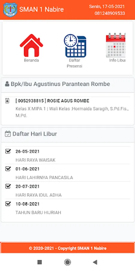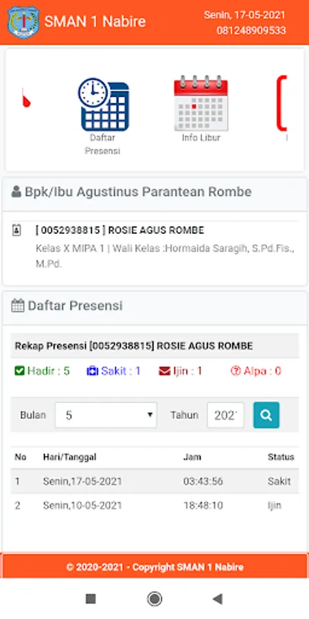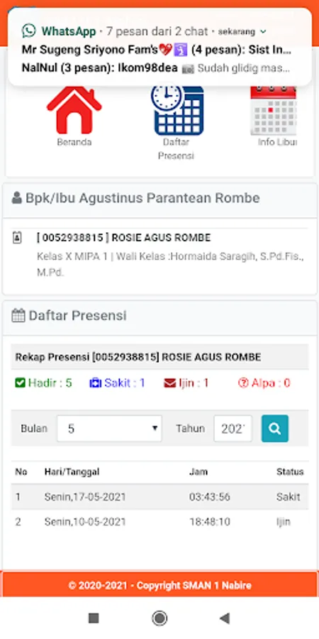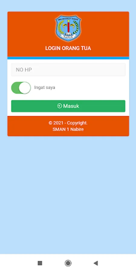 Aplikasi Presensi Siswa SMA Negeri 1 Nabire Modul Orang Tua. Digunakan untuk orang tua siswa dalam memantau aktivitas presensi anak yang menjadi peserta didik di SMA Negeri 1 Nabire.