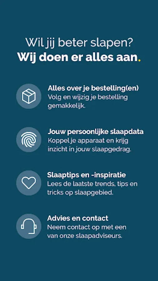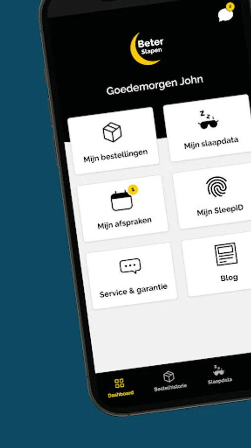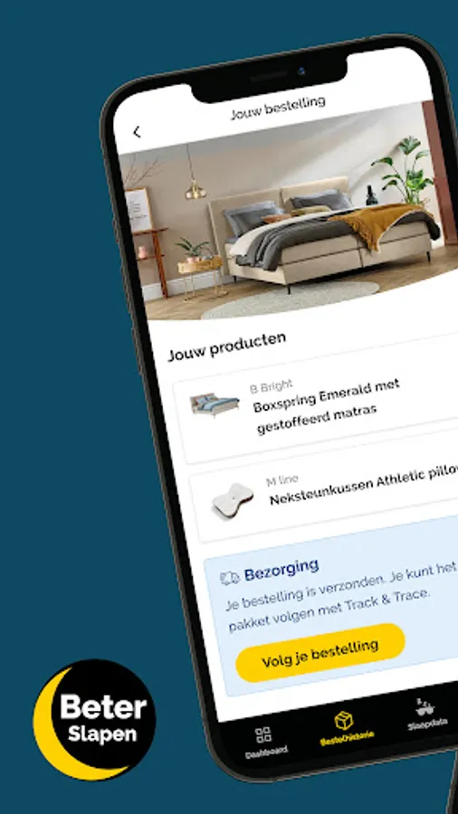In addition to your personal 'My Sleep data', you will find a complete overview of your Beter Bed orders in the Beter Slapen App, you can go to the app for extensive service and warranty questions or requests, view your personal SleepID and find everything you want. know about sleeping, bedrooms, sleeping products, sleeping trends and more through inspiring (blog) content.