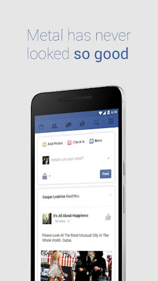 Access your messages, news feed and notifications from any app, with a tap and a swipe. Swipe down the notifications bar and tap an icon. Metal Everywhere opens, allowing you to browse in a floating window, while you wait for a game to load or a photo to download.