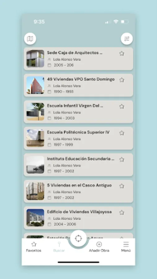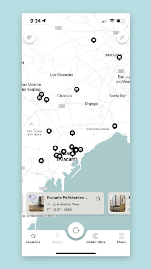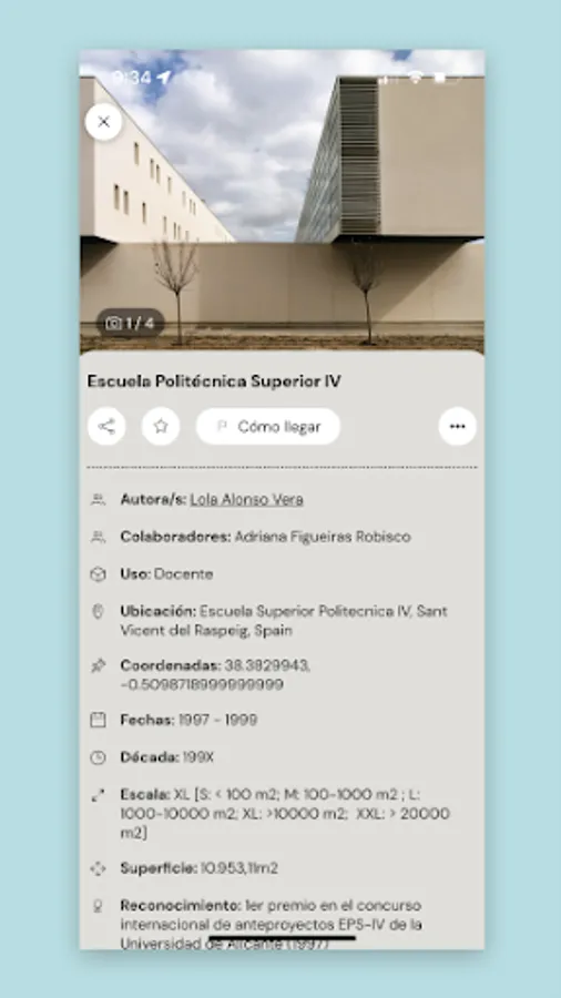 This app offers a continuous content update. On the one hand, through its interaction with Google utilities, it geolocates the works throughout the national territory. This allows you to select points of interest and, with them, generate and save personalized routes based on different search parameters, for example: authorship, type, use, scale or proximity of the works you want to visit. On the other hand, each work also includes a file accessible from the mobile consisting of basic information (author, year of project and realization, surface, etc.), photographs, graphic documentation, available bibliography, other links and explanatory texts that give account of the research performed for each entry.