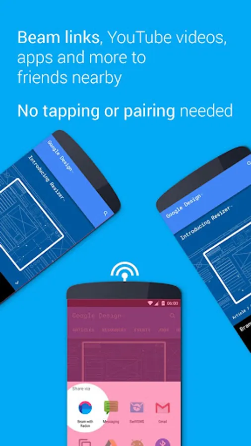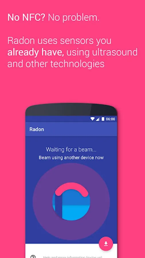 Radon uses your sensors to broadcast links, so you don't need to pair or tap. As long as the other device is nearby, Radon just works.