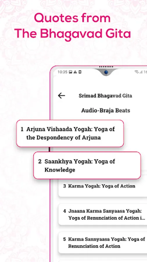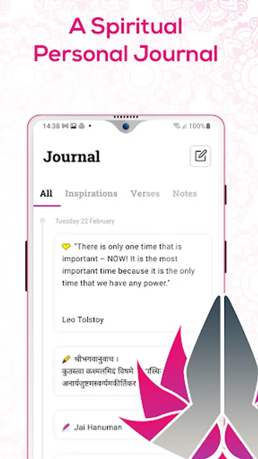 Namah helps you in creating a personalised journal. You can make notes of your inspirations & learnings or hear your favourite Hindu content & verses from 'The Bhagavad Gita' to add them to your personal space. Now you can quickly access your favourite content and share your personalised journal with others.