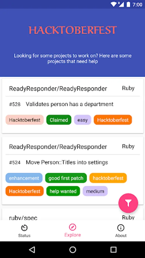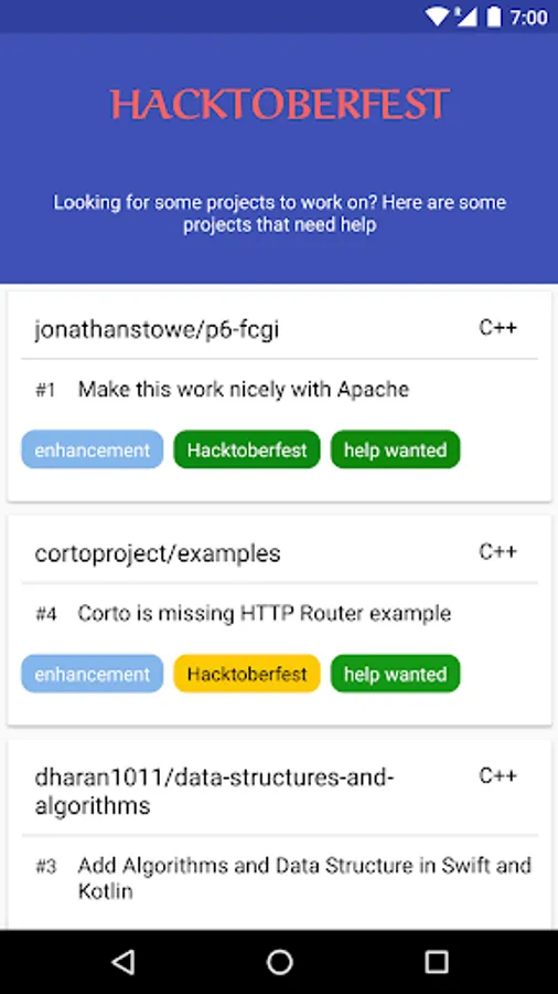 This app allows you to check your Hacktoberfest status and explore issues and projects to get started with open source community.