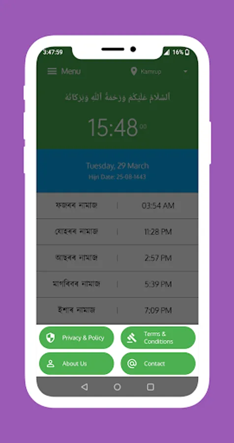 • Shows Five Muslim Prayer Times: Fajr, Sunrise, Dhuhr, Asr, Sunset, Maghrib and Isha.