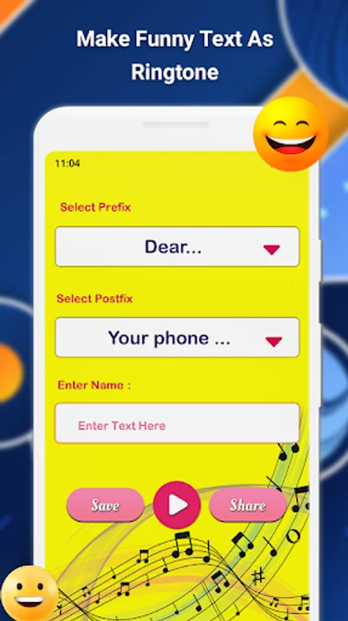 Manually write your name or funny name then select POSTFIX or PREFIX from different options like “Please Pick Up Call, Friend is calling….” & you can get call with friend's name if set as ringtone before. after creating name ringtone.