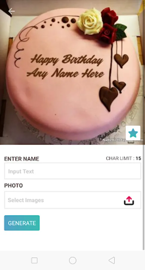 2. Write the name of celebrant whom you want to wish birthday, and press generate button. After a few seconds, you will get a birthday cake with name. It will automatically download in your gallery.