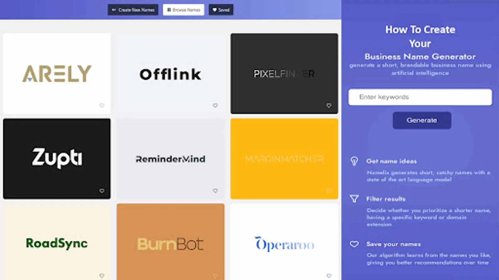 Namelix is a online business name generator that uses AI technology to create brandable names. Namelix generates short, branded names that are relevant to your business idea. When you save a name, the Namelix algorithm learns your preferences and gives you better recommendations over time.