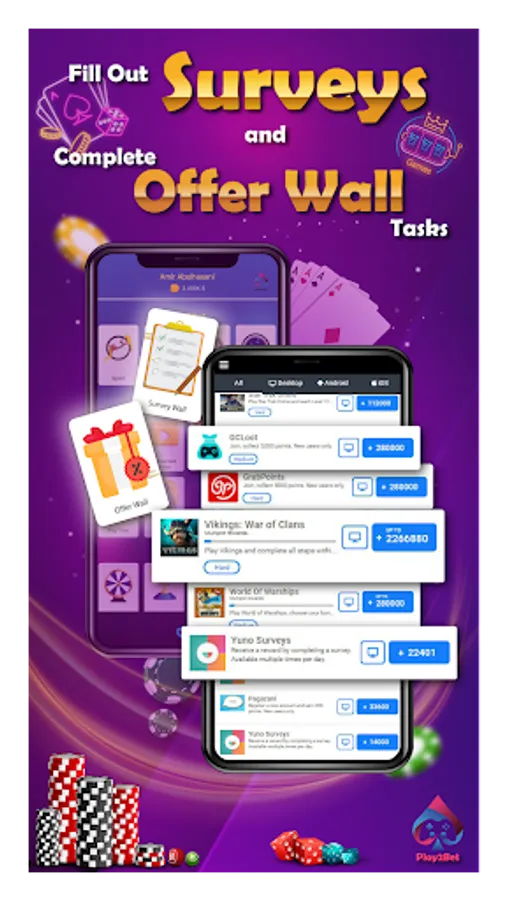 1. Download the app, play games, complete offer walls, fill out surveys, do quests to earn lots of points. 2. Bet with the points you have earned to earn more points. 3. Redeem what you have earned (rewarded) to Gift Cards, etc. 4. Use your Gift Cards wherever you wish.