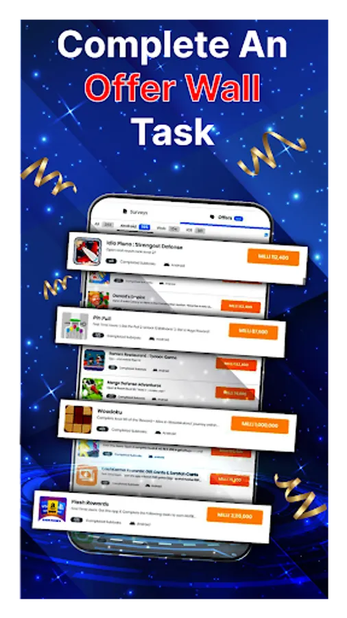 You can enjoy your time and earn points while playing games, completing offer walls and filling out surveys. In offer walls we present you a list of tasks to choose and complete to earn points. These tasks can be games and apps to download and play, etc. In survey walls we ask you to fill out survey(s), questionnaires, to earn points. While playing, you can even get lots of points in bonuses we suggest such as: Leader Board, Jackpot, Weekly Gift, etc. Our bonuses, special levels in the app to reward players, give you the chance of earning extra points for your activity, skill, etc.
