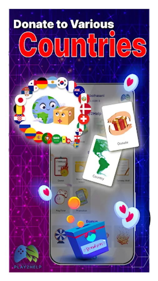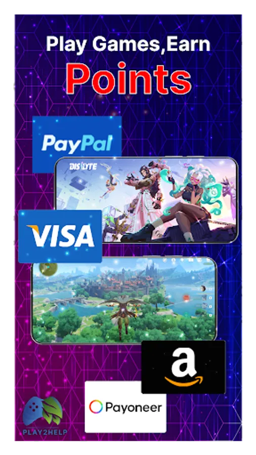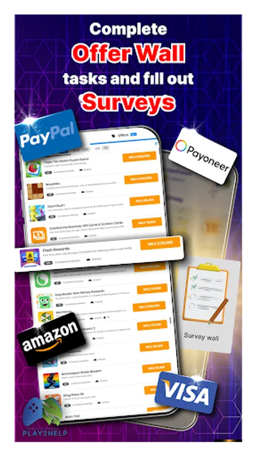In Play2Help, you are provided an app with wonderful games and you will earn points for your spent time, filling out surveys and completing offer walls. In offer walls we present you a list of tasks to choose and complete to earn points. These tasks can be games and apps to download and play, etc. In survey walls we ask you to fill out survey(s), questionnaires, to earn points. While playing, you can even get lots of points in bonuses we suggest such as: Leader Board, Jackpot, Weekly Gift, etc. Our bonuses, special levels in the app to reward players, give you the chance of earning extra points for your activity, skill, etc.