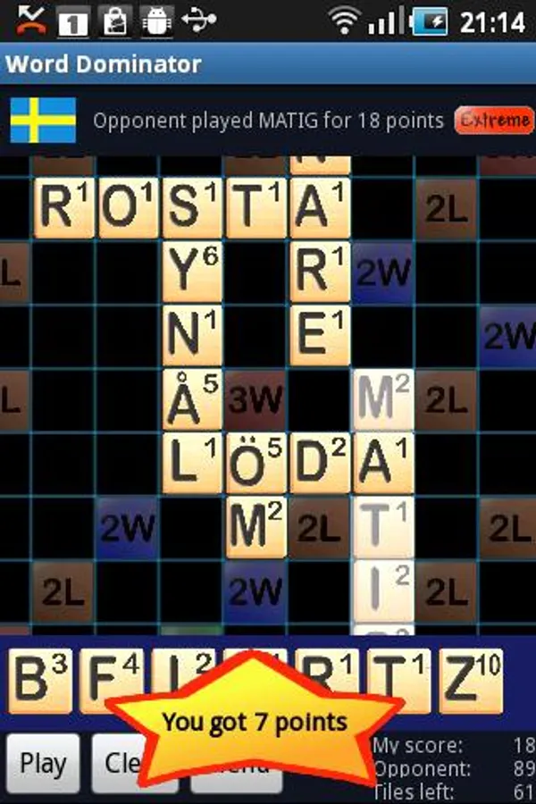 To play a move, first put the tiles forming the word on the board and then hit the 'Play' button. The very first move need to cover the center square.