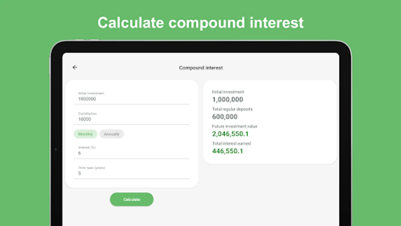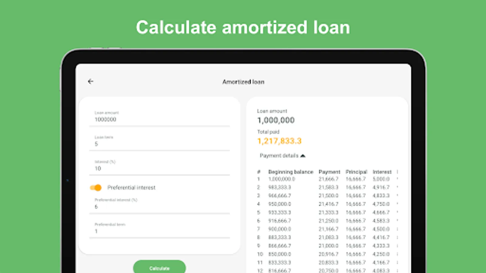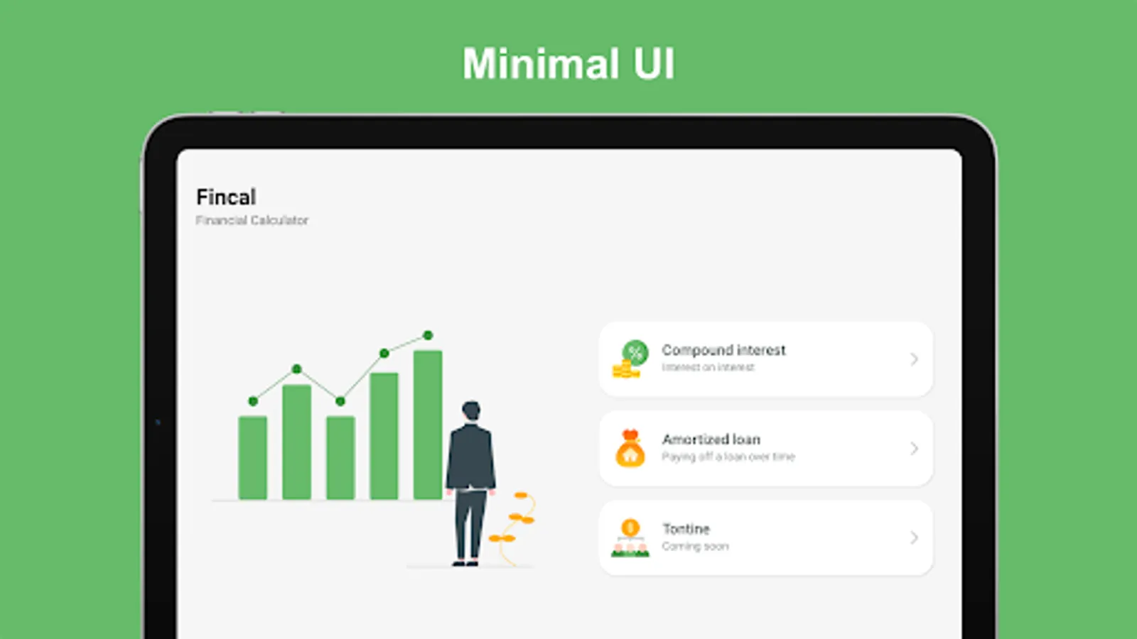 Fincal is a financial calculator which helps you calculate future value of your investment using compound interest and shows how much money you pay in principal and interest over time with amortization schedule.