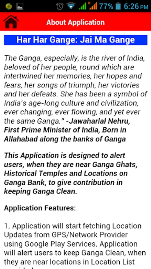 3. Inspired by our Hon'ble Prime Minister Sh.Narendra Modi the application is designed to add in the mission of Namami Gangey by providing a message to keep Ganga Clean.