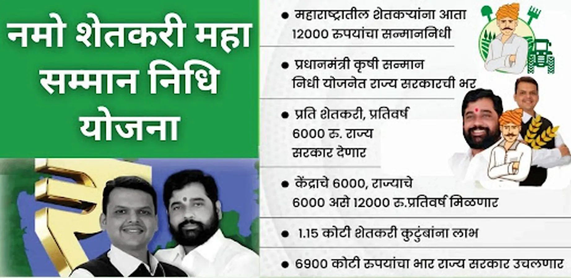 Farmers to get ₹6,000 per year under Namo Shetkari Sanman Yojana.Namo Shetkari Maha Samman Nidhi Yojana 2023 launched, Rs. 12000 per annum to farmers, Rs. 6000 under PM Kisan Samman Nidhi Yojna & Rs. 6000 under Namo Shetkari Mahasanman Nidhi scheme.