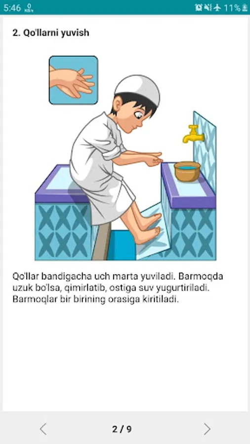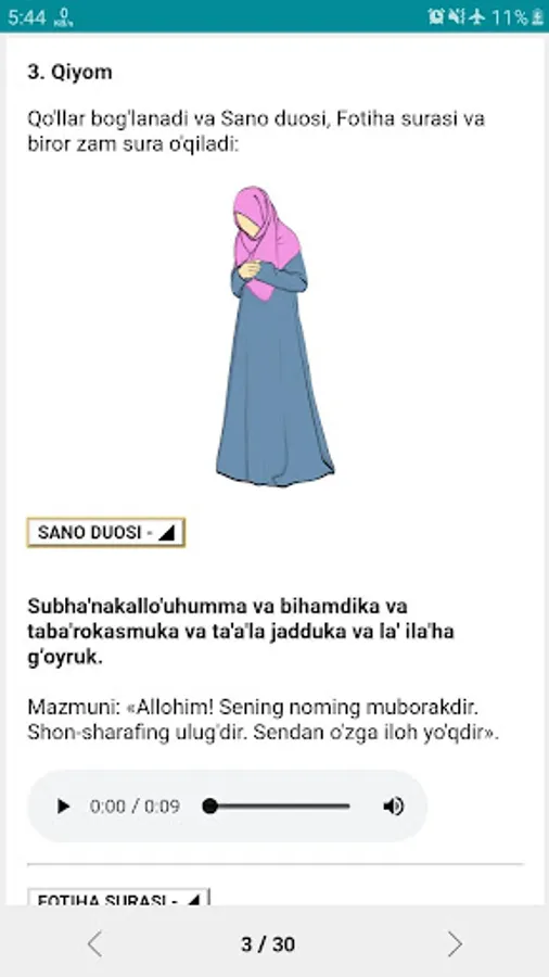 Tahorat olish tartiblari, Namoz oqish tartibi to'liq rasmlar bilan joylashtirilgan bo'lib, duo va suralarning audio mp3 talqini ham mavjuddir.