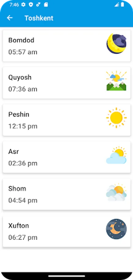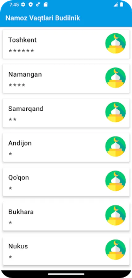 Namoz vaqtlari Uzbeksitan, azon salat Uzbeksitan. Ushbu ilovada siz O'zbekiston, Toshkent, Namangan va O'zbekistonning boshqa ko'plab shaharlaridagi namoz vaqti haqida ma'lumot olishingiz mumkin.