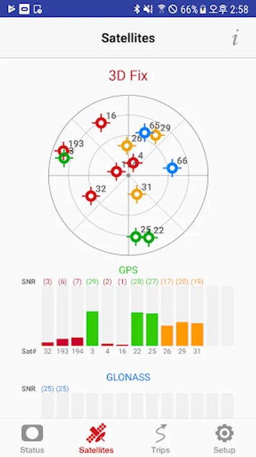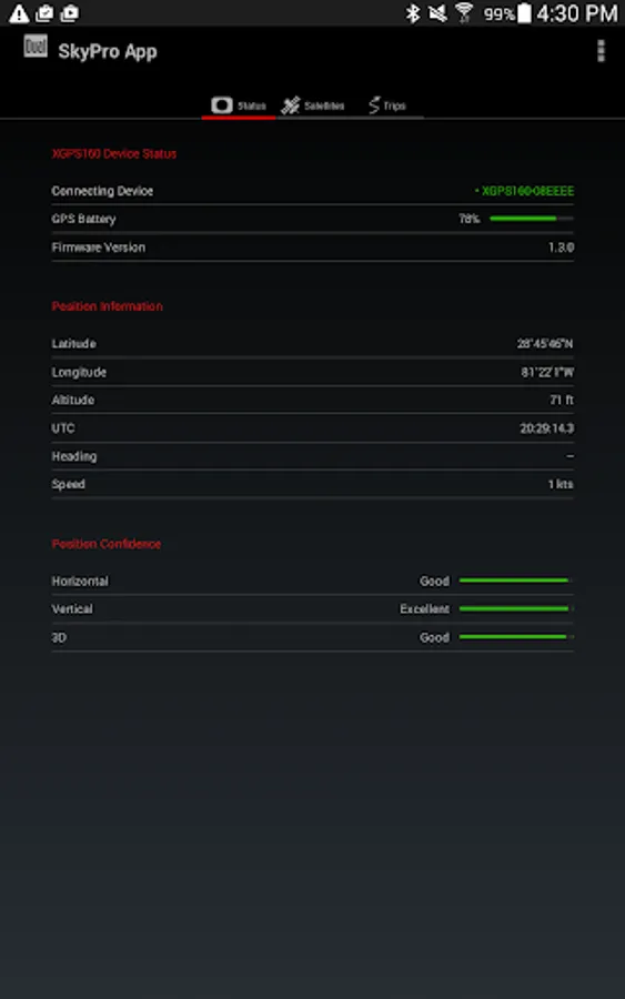 This app shows detailed information from the SkyPro GPS Receiver including: