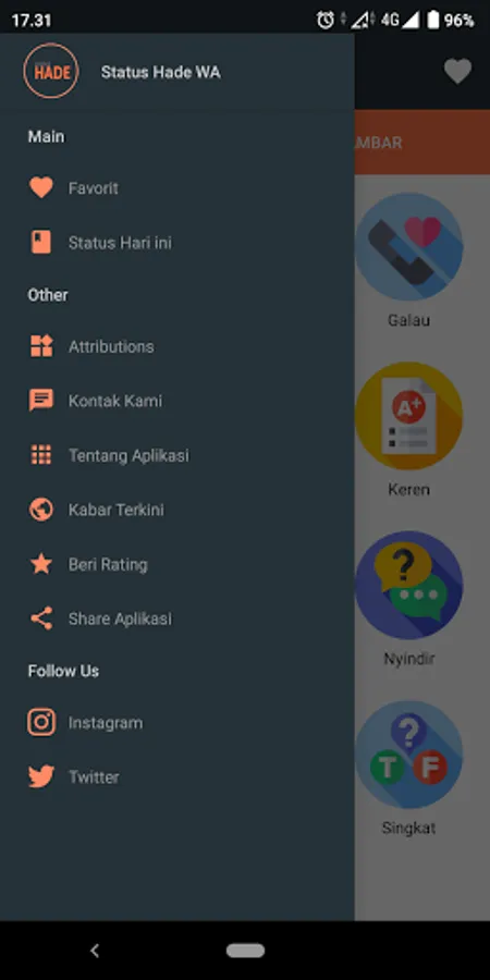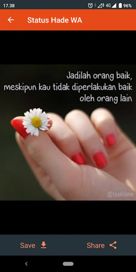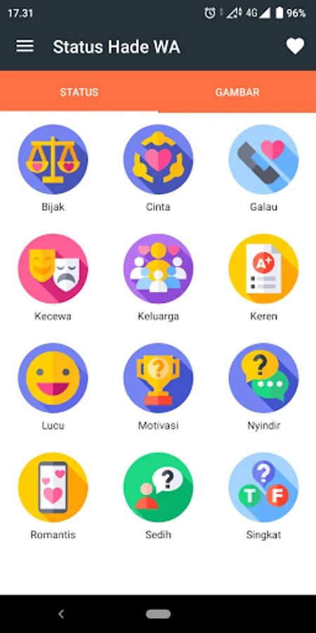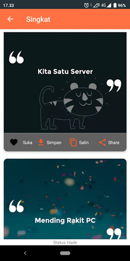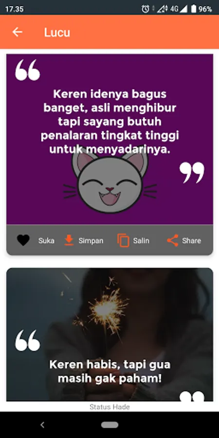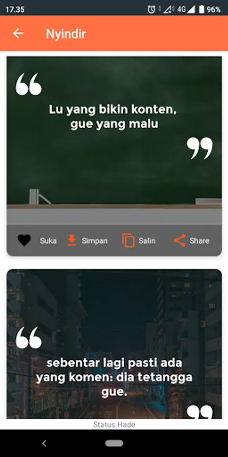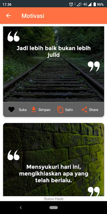 Hade in Indonesian means good, it can be cool and even great. The Status Hade WA application does not offer fancy and wow features, but only comes to accompany you when you are lying down and lazy to think about what status to write, because through this application you only need to copy and paste.