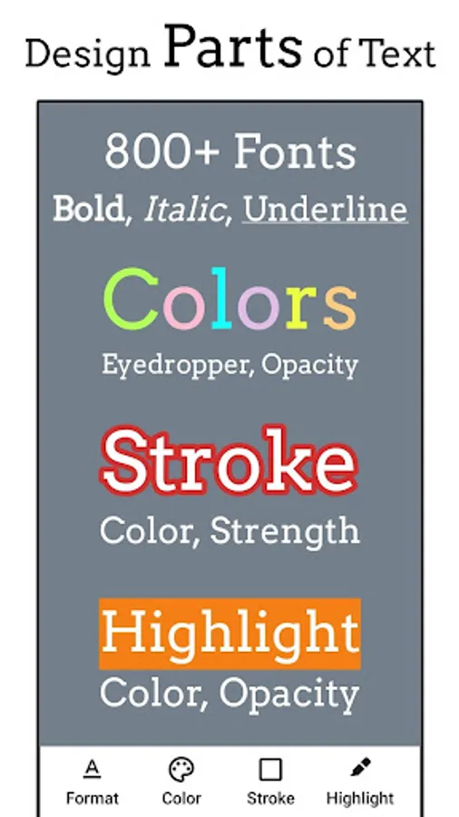 • Design parts of the text separately: supported in Font, Format, Color, Stroke, Highlight tools