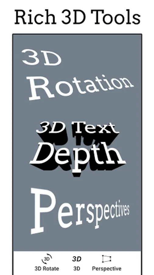 • 3D text tools: 3D Rotate, 3D Depth, Perspective