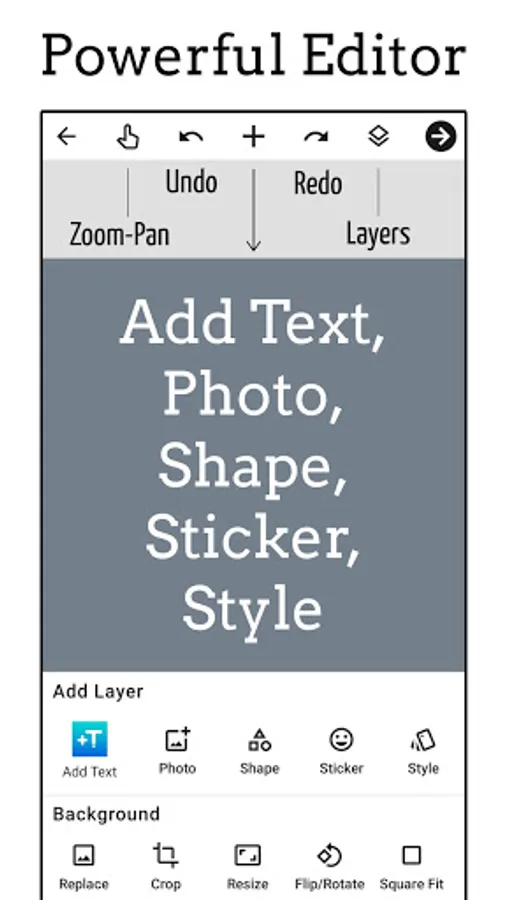 • Add layers: texts, photos, shapes, stickers and saved text styles