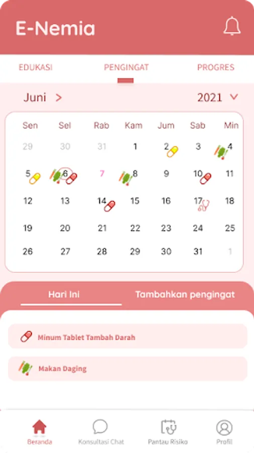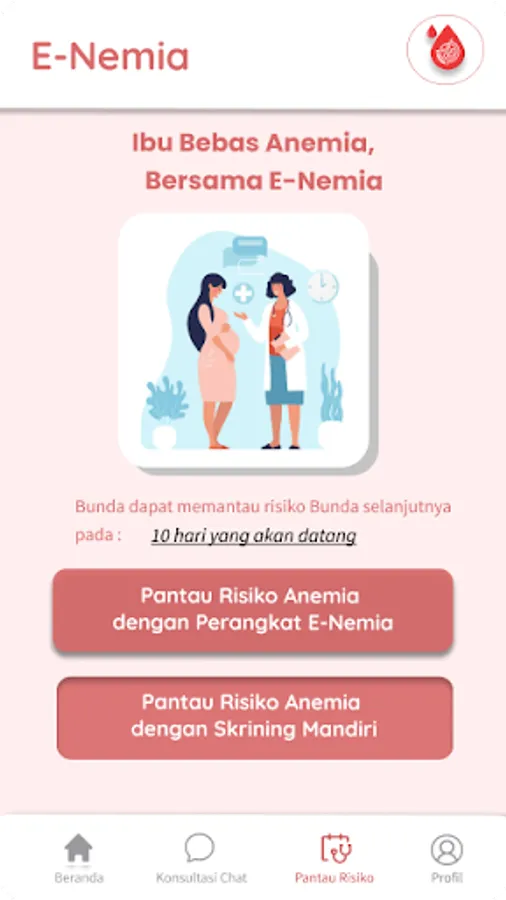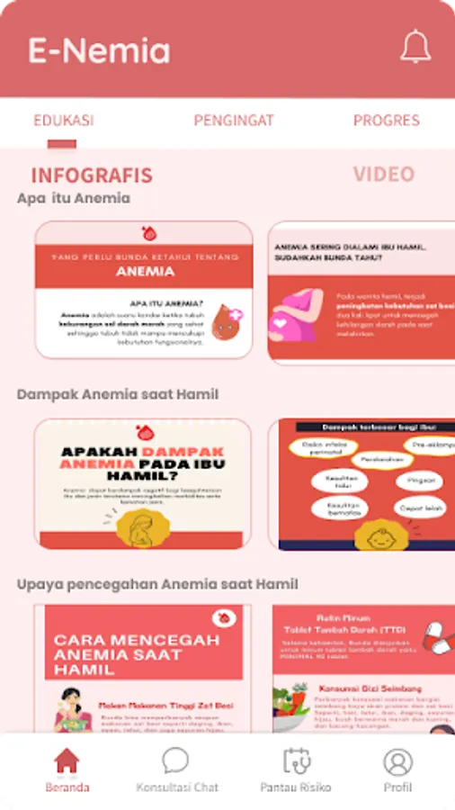 The E-Nemia application is here to provide easy access for pregnant women in increasing knowledge and monitoring the risk of anemia. There are risk monitoring features, education, and reminders for the consumption of blood-added tablets to support pregnant women free from anemia. Other features such as the progress feature will record a history of activities that have been carried out by the user. In just one application, users can find a variety of these features.