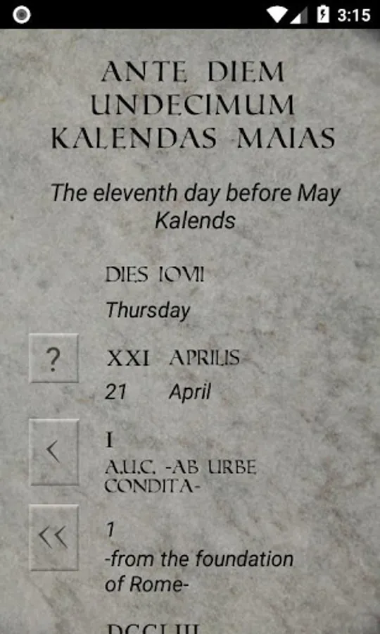 The ancient Romans called the days of the month, referring to the Calends, Ides and Nones, and that is what this application does: by entering a date, shows his wording in Latin (one of several). For ancient dates it shows some information about the organization of the pertinent calendar. The application considers the Gregorian and Julian calendars and a reconstruction of Numa and Romulus (or Roman) calendars.