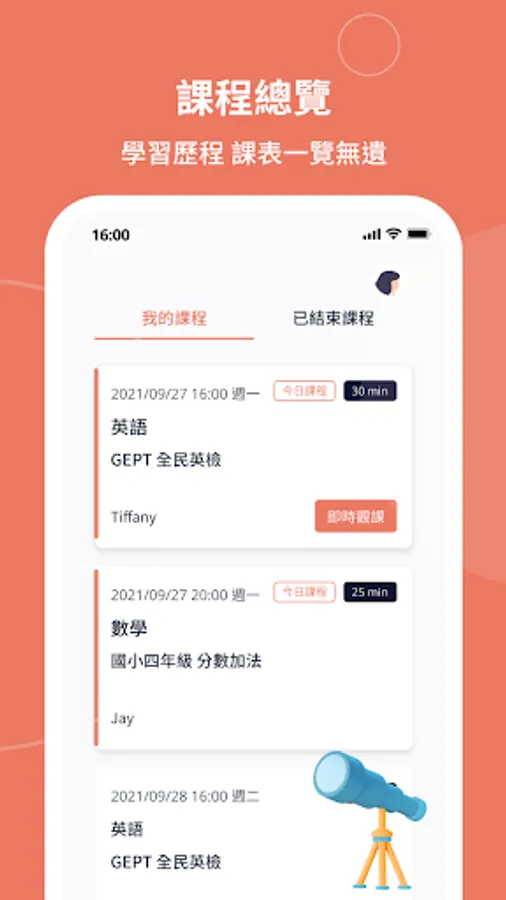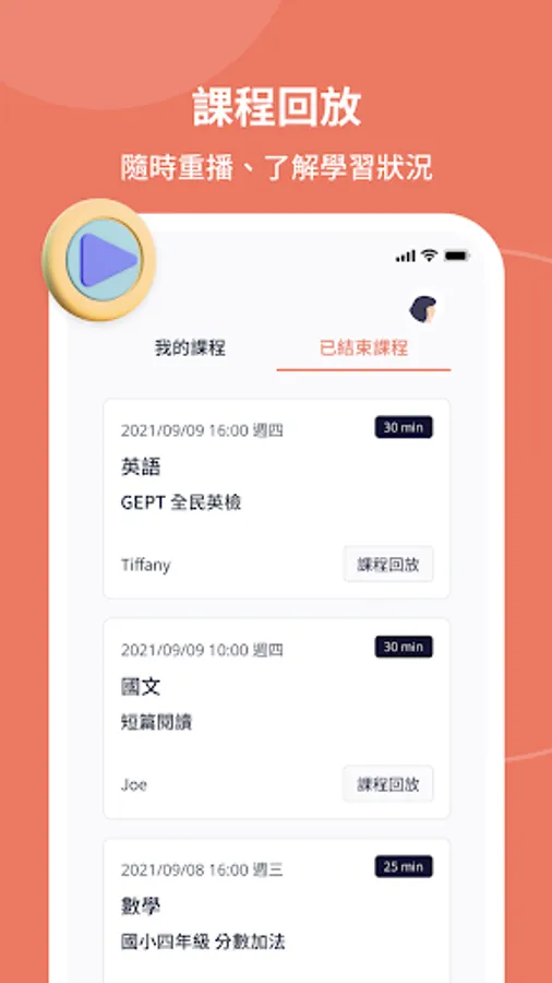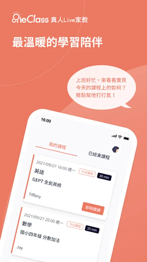 In order to allow parents to enter the online learning classroom and participate in their children's learning, OneClass is designed for parents to create the most convenient online course companion app. No matter when and where, you can grasp the child's real-time learning situation at any time with one machine. The easy-to-use parent education app, the most professional live online course service!!