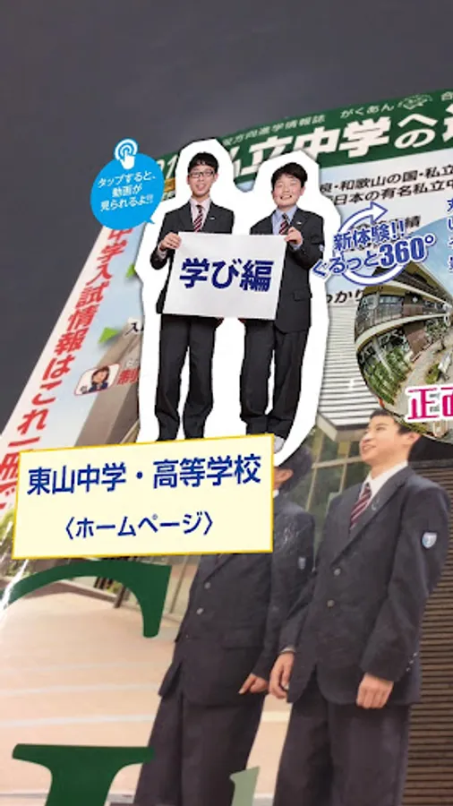 2. When holding the camera to the image to be a marker of Gakuan in the books, pop-up emerge, you will see the AR content, such as when you tap a link to introduce video and web site of the school.