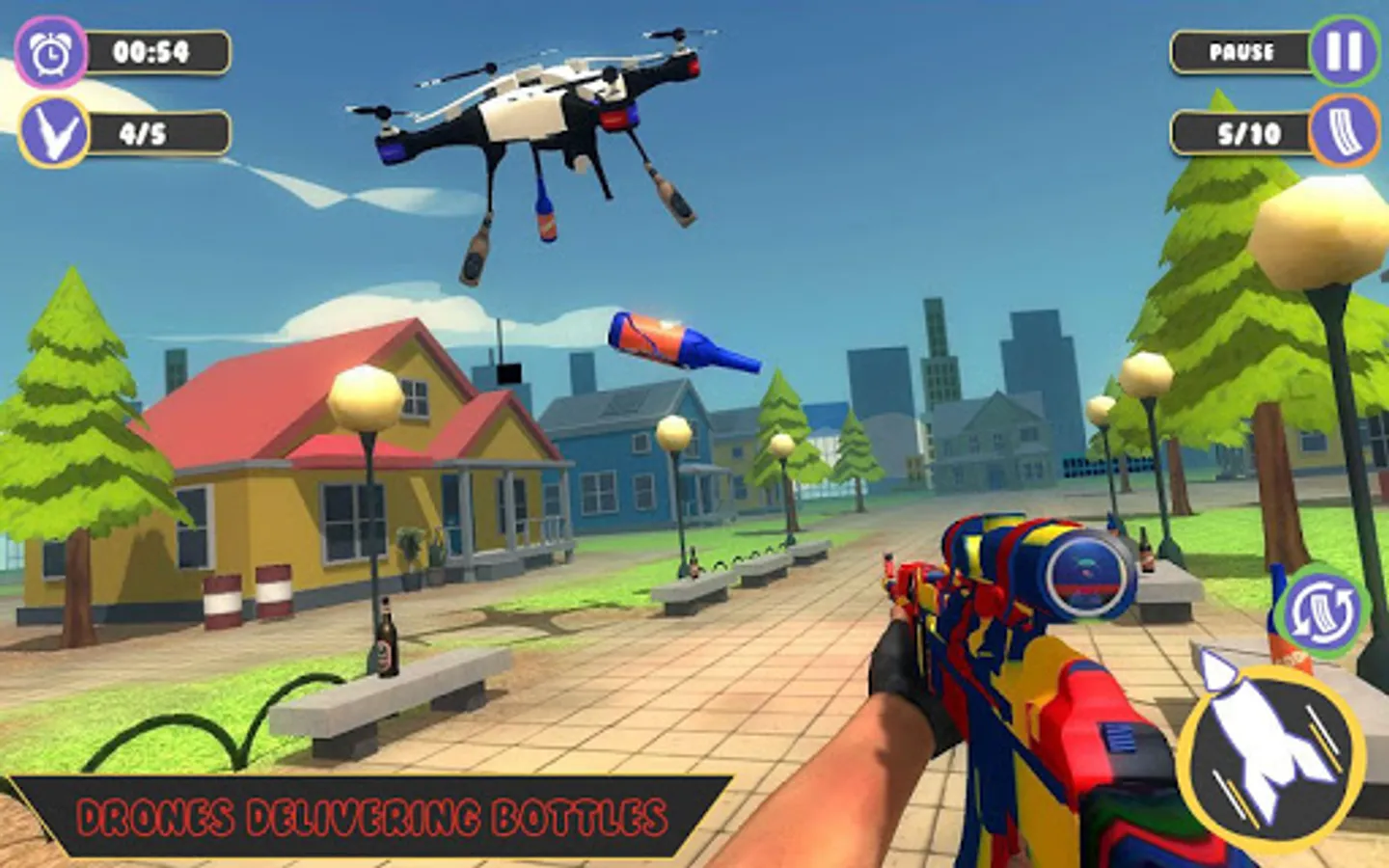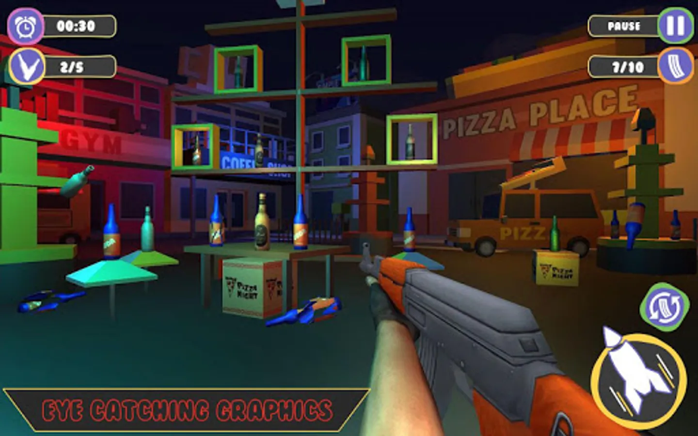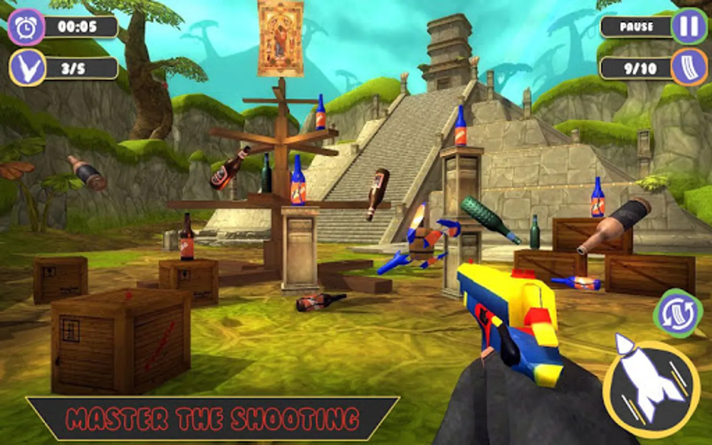 Take control of your gun and shoot down all the flipping bottles to become the ultimate shooting master in Bottle Flip Shooting Challenge 3D game. As it progresses, the obstacles get harder, with rotating, flying, speeding objects. In case of a rag-doll target, score the highest and try not to hit your buddy. Win gold medal with the top scores on the leader board. With 30 levels comprising of unique target and 10 gun upgrades and environmental themes, this bottle shooting game is sure to keep you addicted for hours.