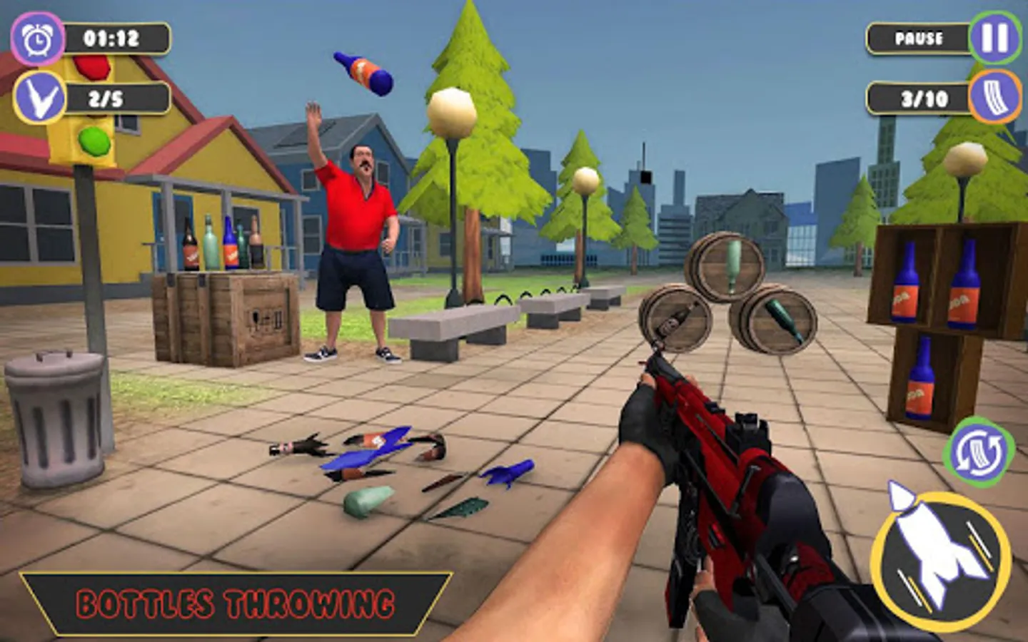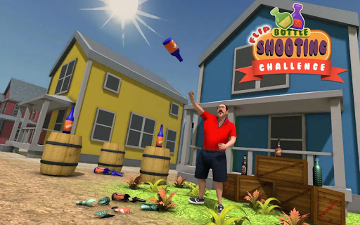 A man in red shirt throw the bottle up player need to shoot the bottle before it hit the ground. And its one type of multi-type levels of Flip & Shoot.