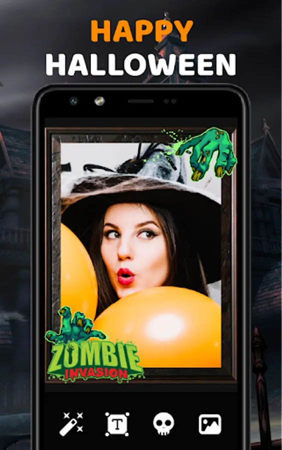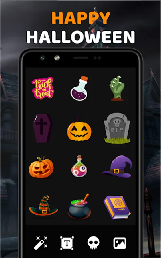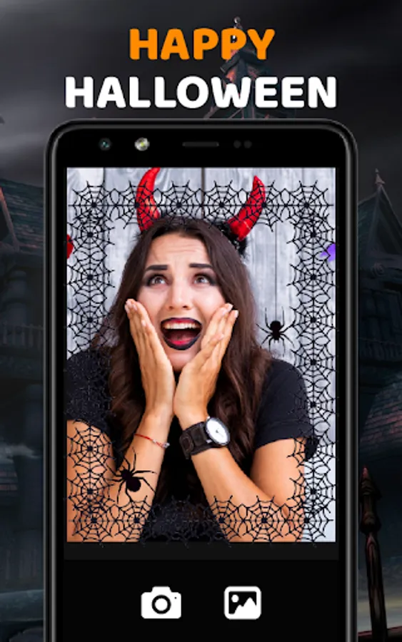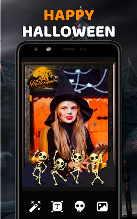 Easy to make Halloween photo. Add beautiful halloween stickers and frames on your picture.You can edit photo with advanced editor for add effect filters,text,chop,blur,rotate and more feature.