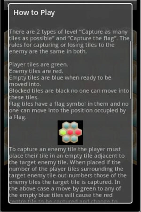 The game is played on a hexagonal board of varying size. Each level is an exciting new challenge where moves must be carefully considered. Included are 2 types of level: straight “win as many tiles as possible” and “capture the flag”. In both level types the player plays against computer once the player wins a level the next level becomes available to play.