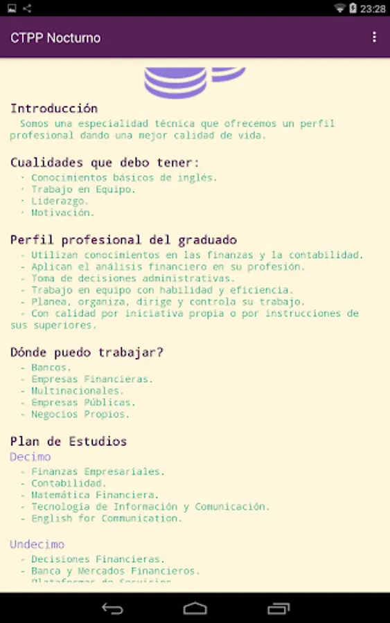 This application is developed with the aim of providing information on technical courses offered in the evening technical section of the professional association of Puriscal.
