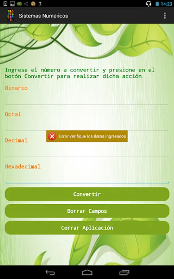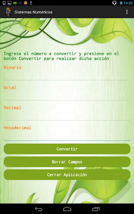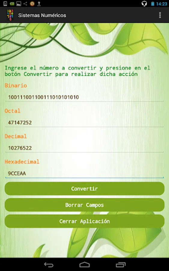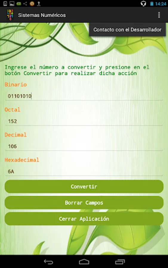 This application allows you to convert numbers into its equivalent in each of the number systems (Binary, Octal, Decimal and Hexadecimal).