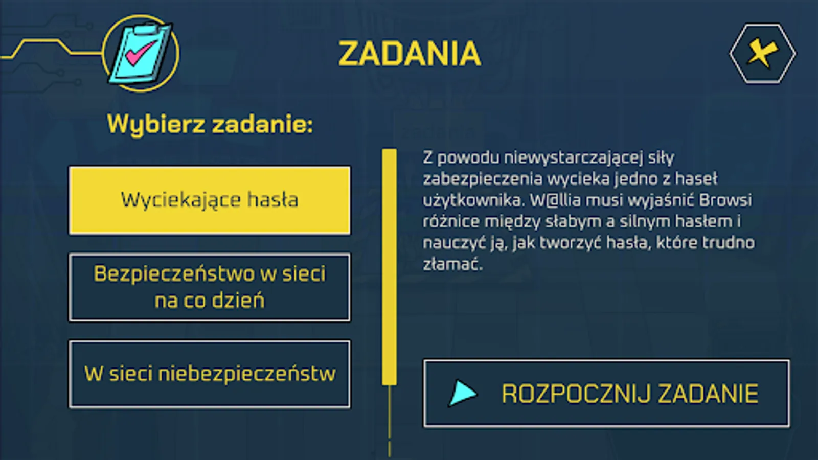 The tasks and quizzes included in the game concern issues such as: strong passwords, protection of personal data and online identity, fake news, harmful and illegal content, pathostreams.