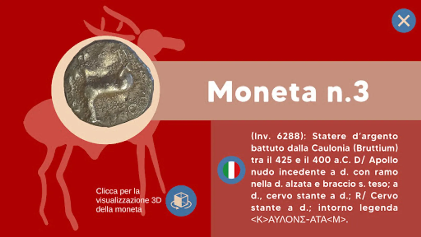 This App shows the user all the coins from display cases 1, 2 and 6 of the Vito Capialbi National Archaeological Museum in Vibo Valentia in digital format, divided into sections that respect the original exposure.