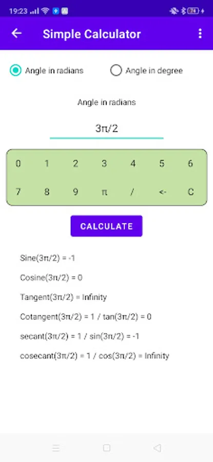 cosine, tangent, cotangent, secant, cosecant angles value in one click.
