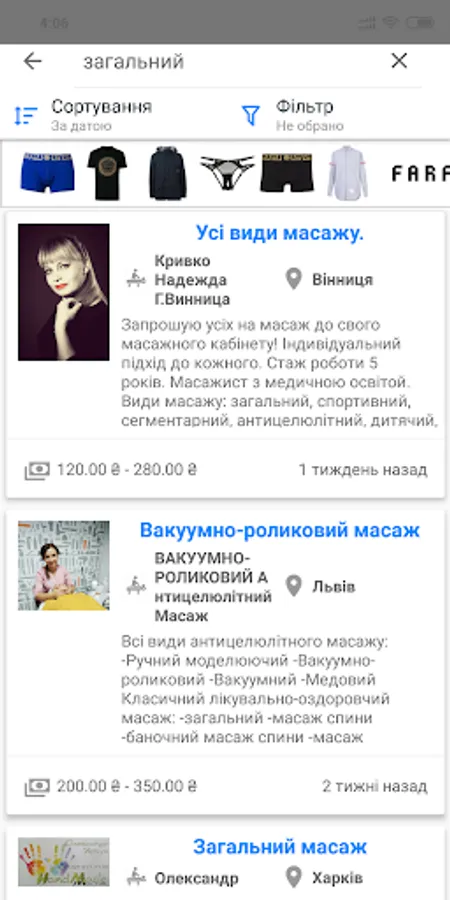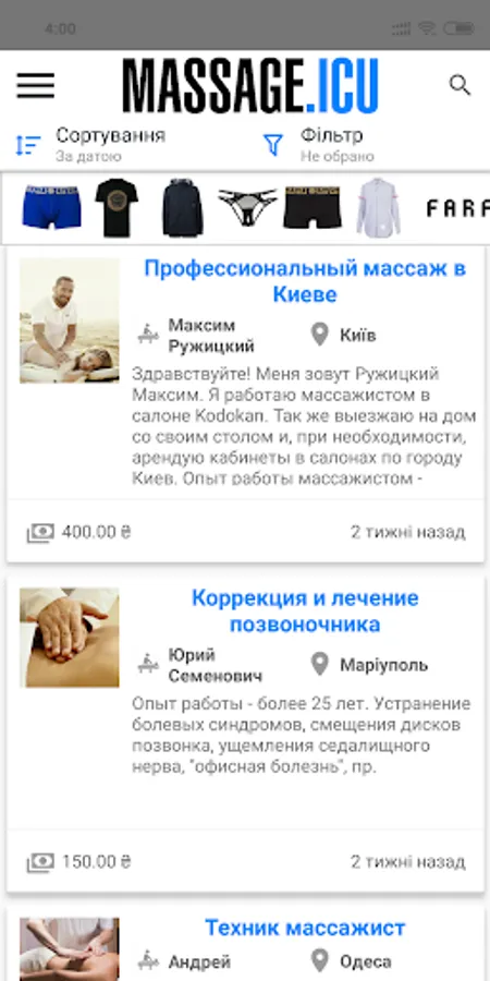 In our application you will find hundreds of masseurs in dozens of Ukrainian cities. The mobile app will make searching easy and eliminating the problems with the selection of specialists.